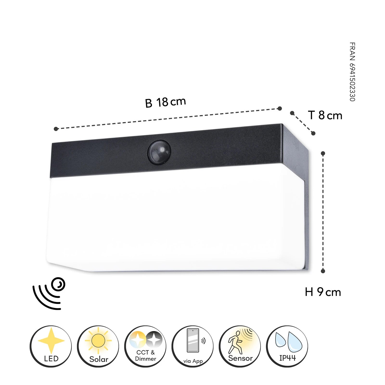 FRAN is a cordless, solar wall light in a modern and minimalist design. It is charged by sunlight during the day and turns on automatically when detecting motion. The light is perfect for illuminating your main entrance, driveway or other areas with a lot of traffic. Easy installation with no cables needed. Thanks to the connected module you can light your outdoor space completely to your personal taste via the free app.
